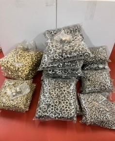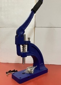 Øskenpresse med 4 stempler og 20 poser assoterede øskener i forskellige størrelser (ca. 2.000 stk.).